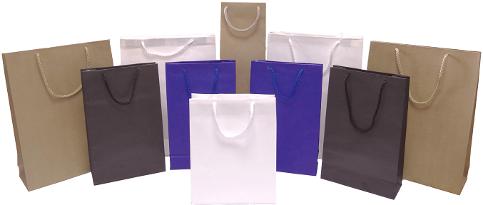 Tašky jsou vyrobeny z papíru, gr. 110 - 130 g/m2, úchyt je šňůrový.